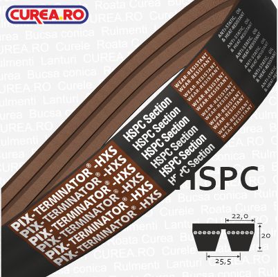 Banded narrow profile SPC V-belt. The nominal size is Lp. The section width of the strap is 22mm, the profile height is 18mm. The total height of the banded HSPC belt is ~22.5mm. The centre of the adjacent V-belt tracks is ~25mm apart. The Megadyne Pluriband and PIX Duraband banded V-belts are made of normal NBR material with a normal force thread. PIX Muscle banded V-belts are made of fiberglass reinforced EPDM material with maintenance-free power carrier.