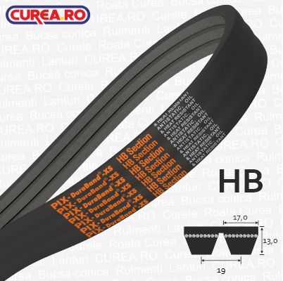 Átlapolt klasszikus 17-es profilú ékszíj. A szíj profilszélessége 17mm, profilmagassága 11mm. Az átlapolt HB szíj teljes magassága ~13mm. Az egymás melletti ékszíjpályák közepe ~19mm távolságra helyezkedik el egymástól.
